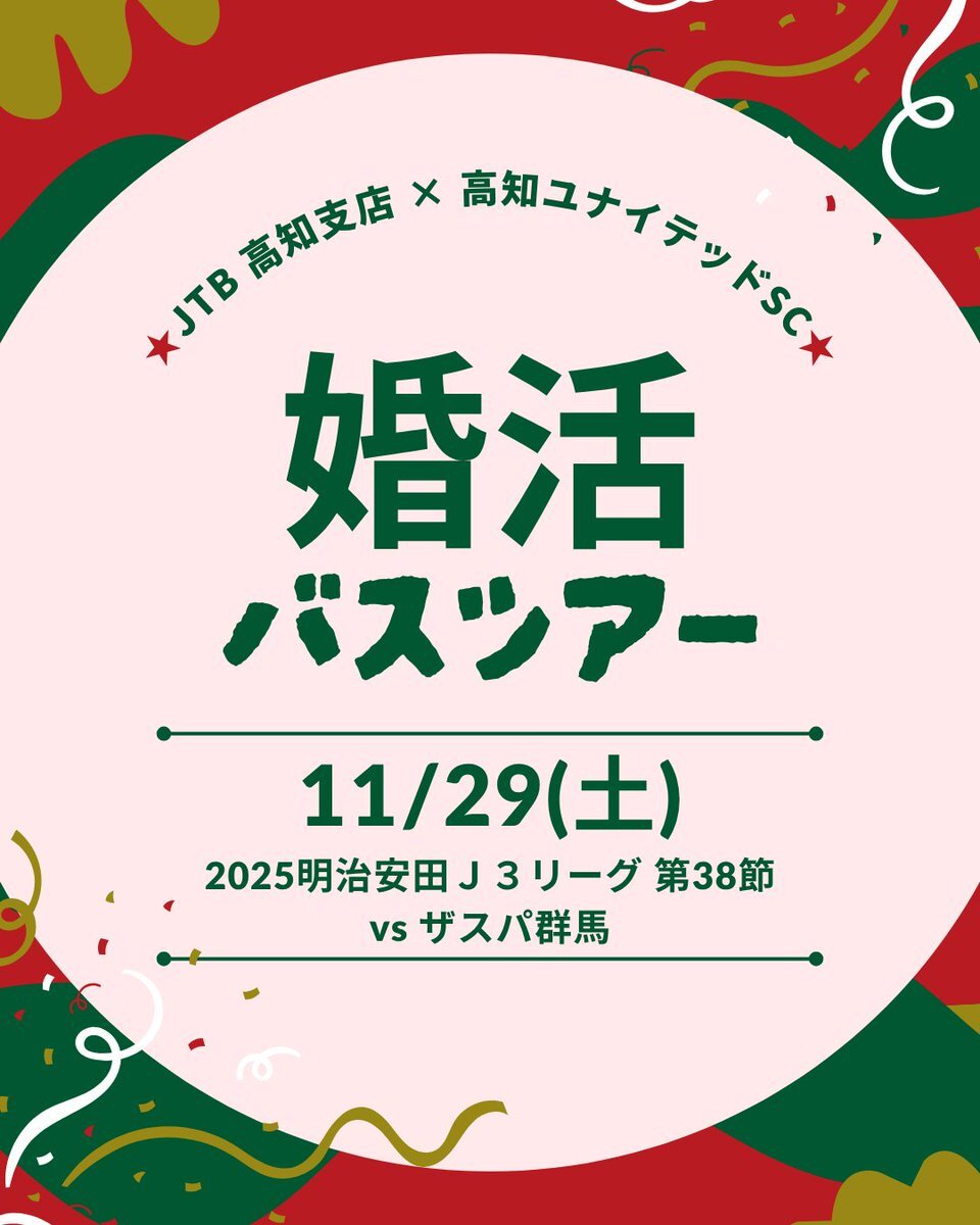【11/29(土) 群馬戦】 #JTB × #高知ユナイテッドSC による「婚活バスツアー 第2弾」お申込み受付中❤️💚 サッカーを愛する独身の皆様、スポーツ観戦が好きな独身の皆様、素敵な出会いのチャンスです! ご参加の方には、グッズのプレゼントも🎁 🔽詳細はこちら kochi-usc.jp/news/news-5342… #高知一心 x.com/kochi_united/s…